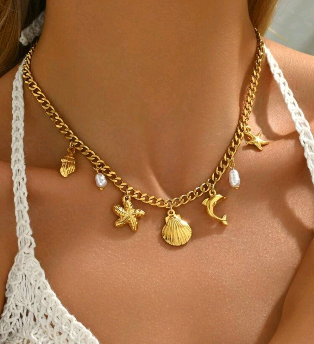 Bahr captures the serene beauty of the sea with its exquisite 18k gold-plated design, featuring delicate shells and lustrous pearls. Lightweight and versatile, it adds a touch of coastal charm to both casual and formal outfits, allowing you to carry a piece of the ocean's beauty wherever you go.