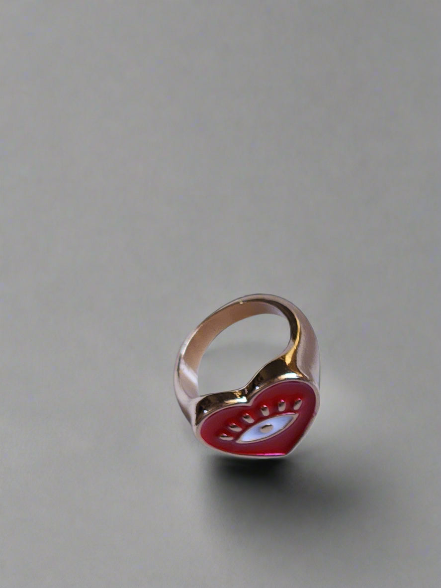 A stainless steel ring with a bold heart-shaped design, featuring a red enamel background and an eye motif with golden accents. A unique statement piece that adds a mystical vibe to your style. fits last 2 fingers