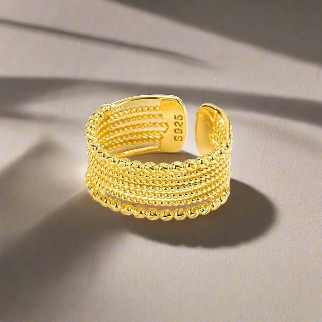 This stunning S925 sterling silver ring features a vintage wide weave design and is elegantly gold-plated. Adjustable for a perfect fit, it adds a unique and stylish touch to any outfit, making it a versatile accessory for both everyday wear and special occasions.