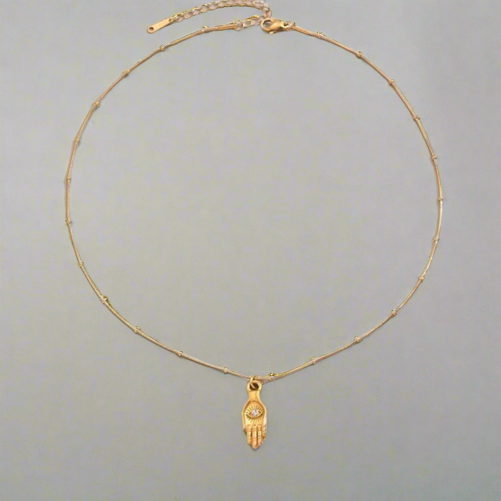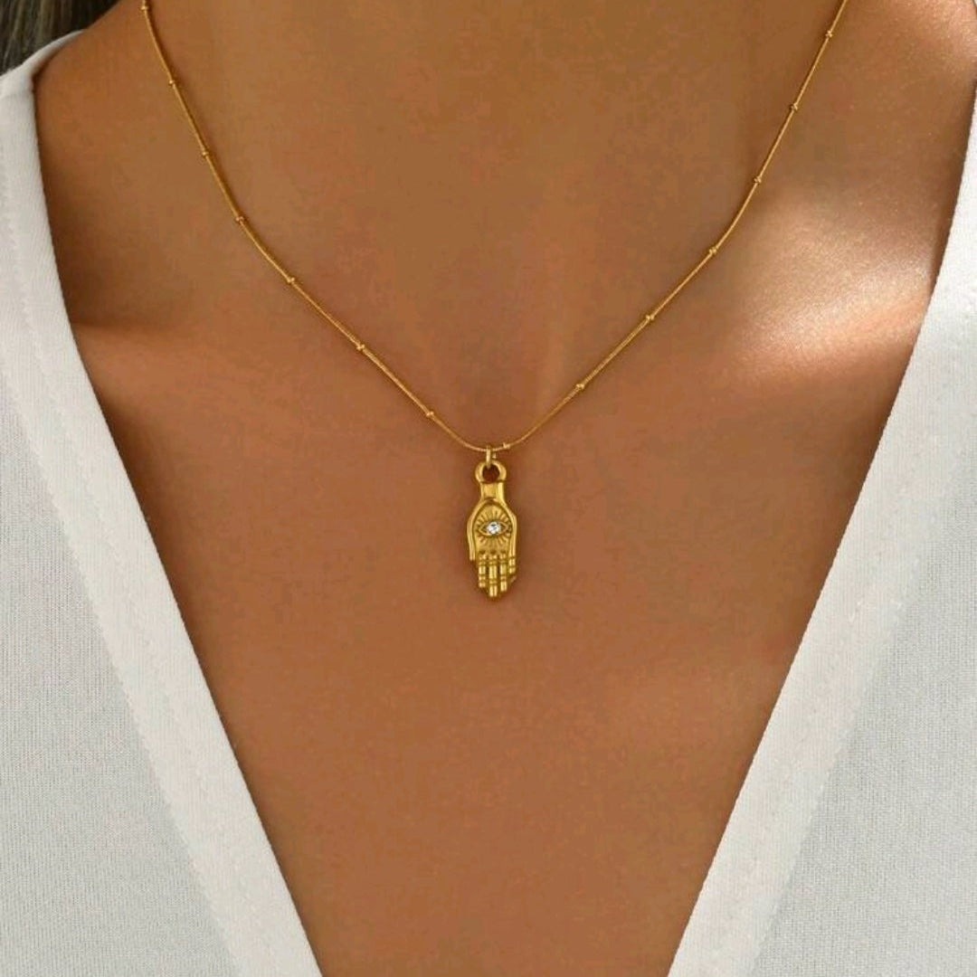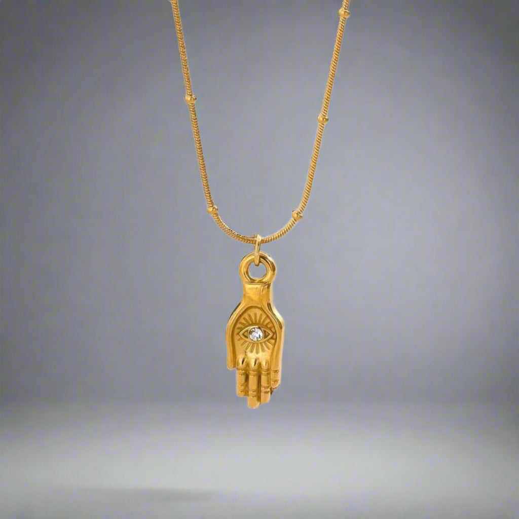 This 18K gold-plated stainless steel necklace features a zirconia eye and hand pendant, symbolizing wisdom and protection perfect for everyday wear.