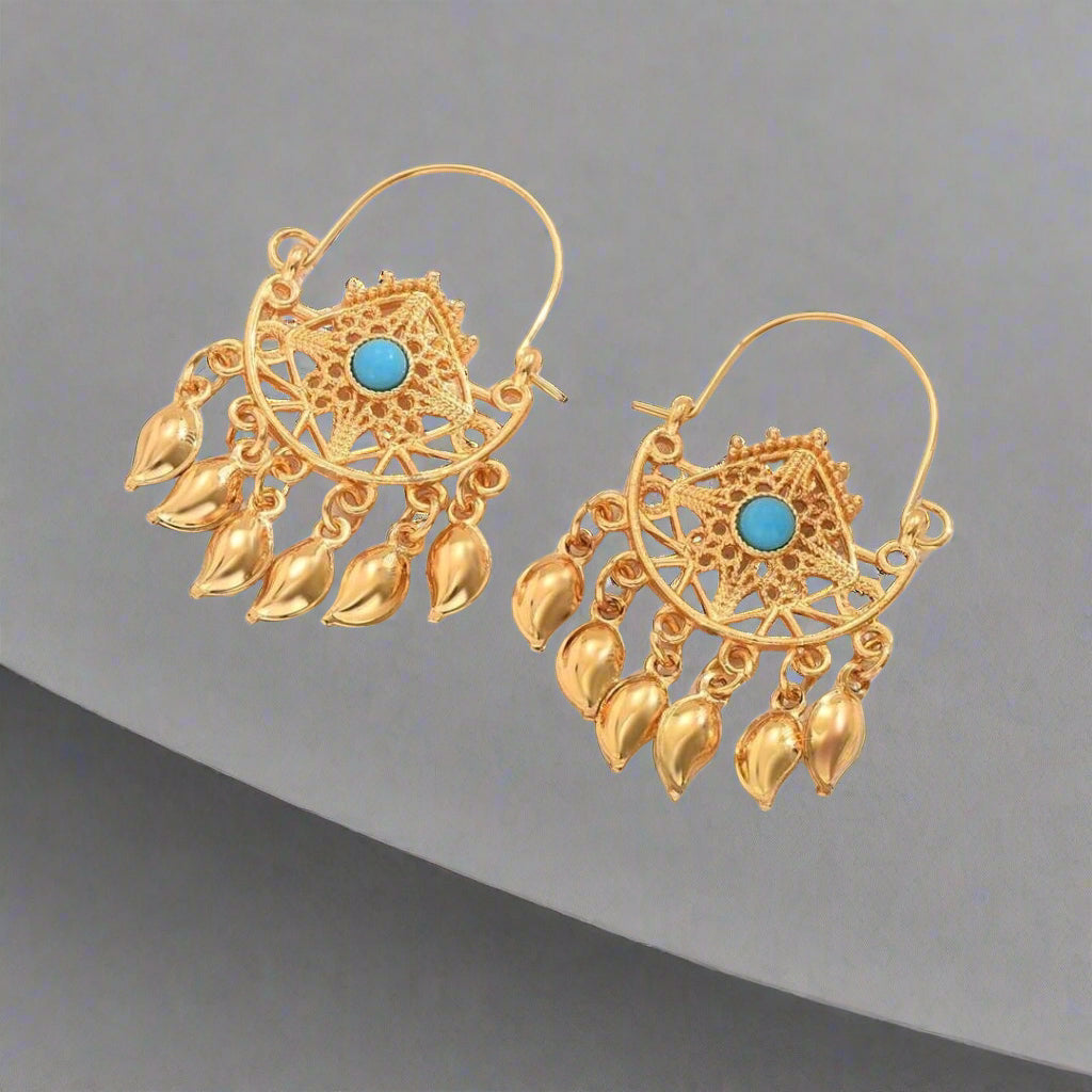 These 18K gold-plated earrings are inspired by the royal artistry of Rajasthan. The intricate filigree design, accented with a striking turquoise stone, captures the essence of Indian heritage, while the golden teardrop charms add a graceful, rhythmic sway. A perfect fusion of opulence and culture.