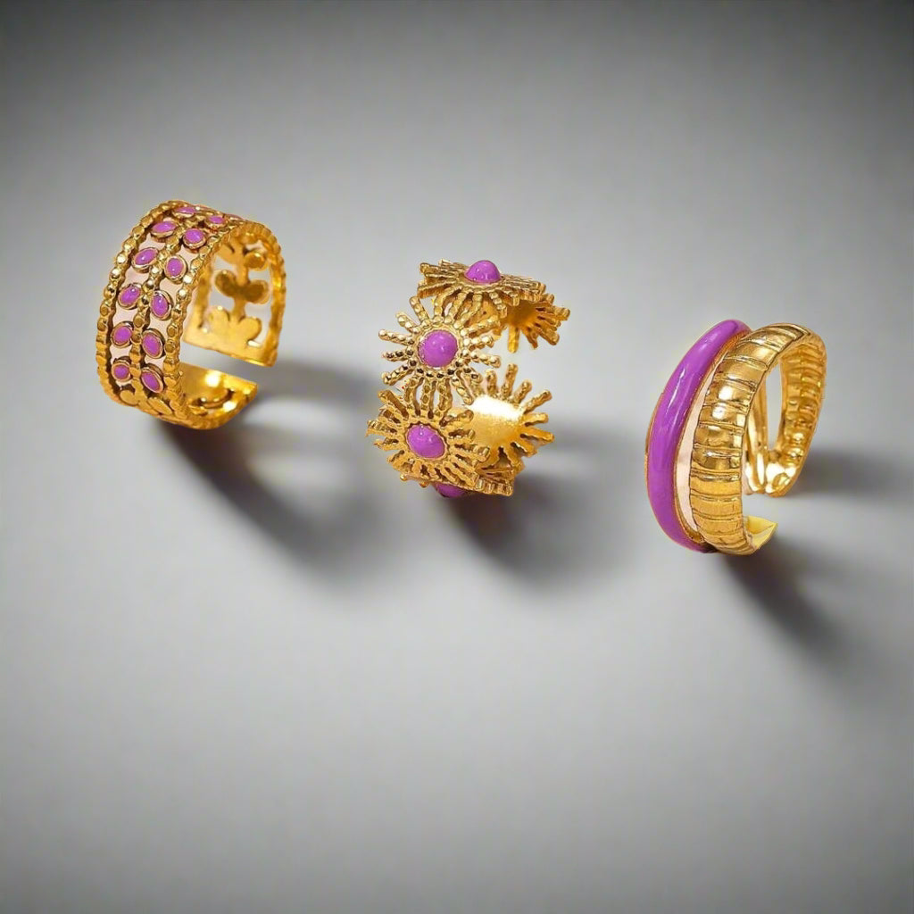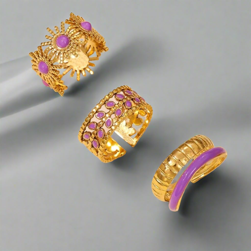 A sleek 3-piece minimalist ring set, crafted from stainless steel with a serene purple oil drip finish.