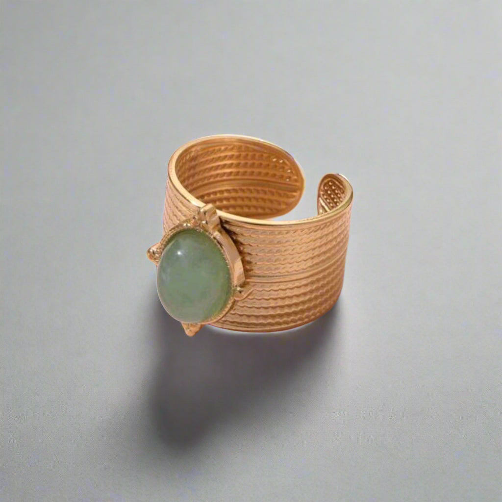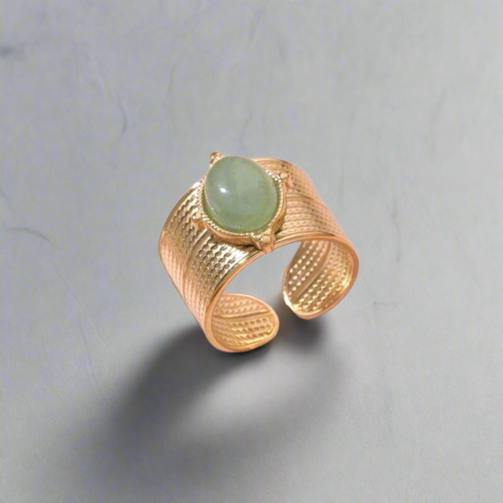 A stunning 14K gold-plated stainless steel ring, crowned with a luminous light green stone. A perfect blend of elegance and modern sophistication.
